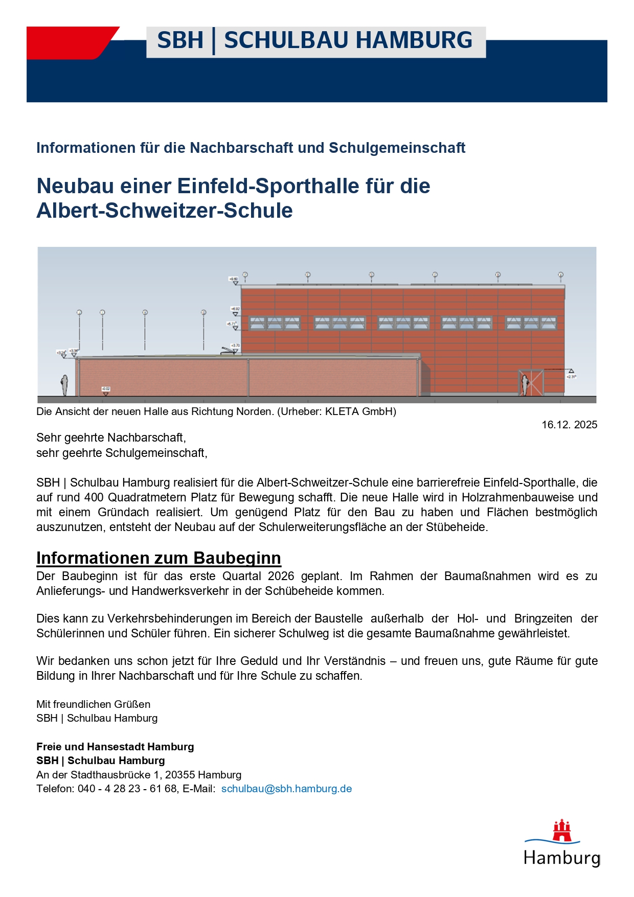 Im ersten Quartal dieses Jahres soll der Bau der neuen Sporthalle beginnen. Alle weiteren Informationen befinden sich im Schreiben der Behörde.