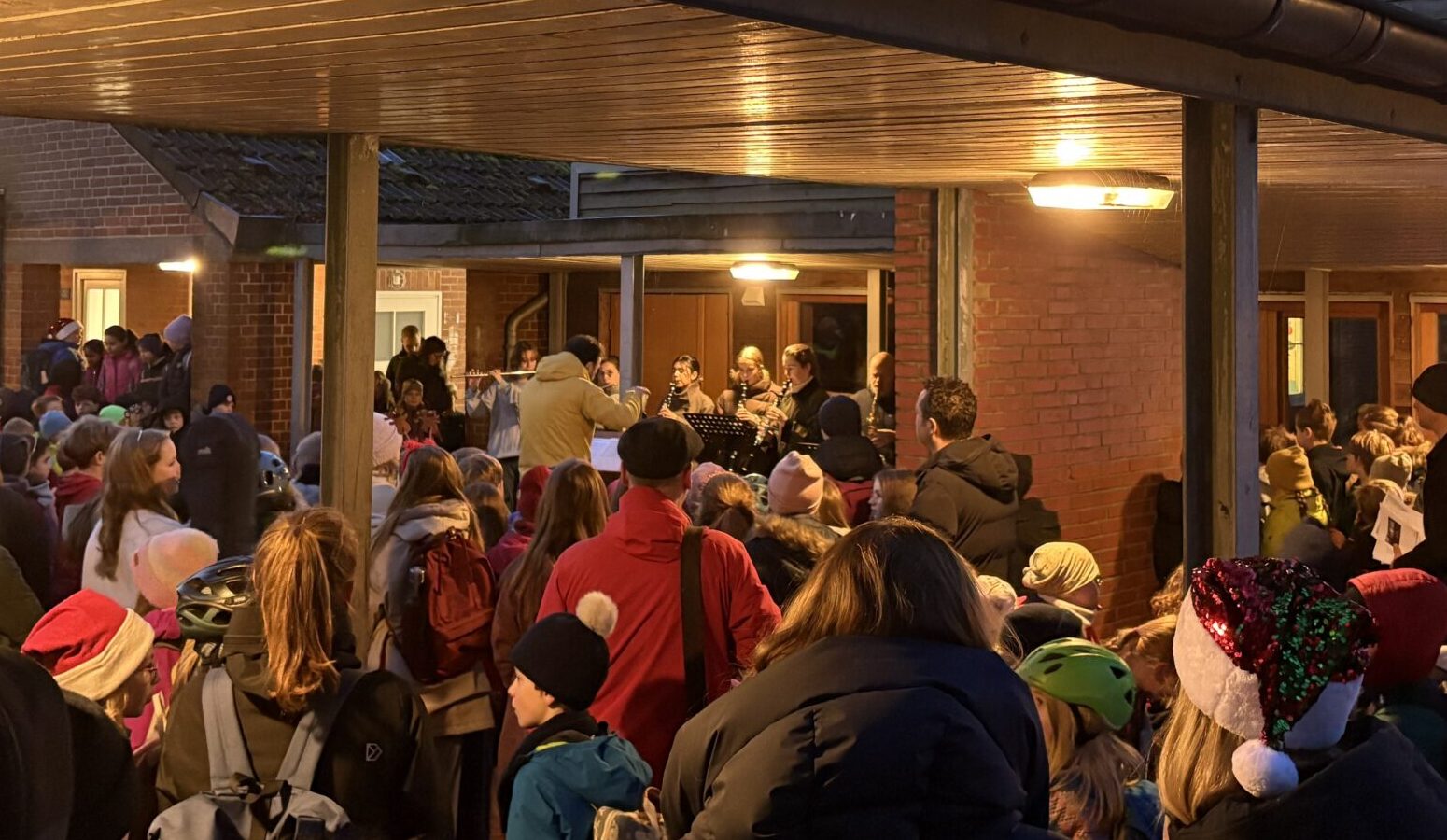 Am letzten Schultag vor den Weihnachtsferien bleiben traditionell alle Türen bis 8:00 Uhr geschlossen. Die Schüler*innen versammeln sich auf dem Schulhof vor den Klassenhäusern und hören von einem kleinen Ensemble aus Blasmusiker*innen klassische Weihnachtslieder zur Einstimmung auf das bevorstehende Weihnachtsfest. Ein Ritual, das uns jedes Jahr Freude bereitet.