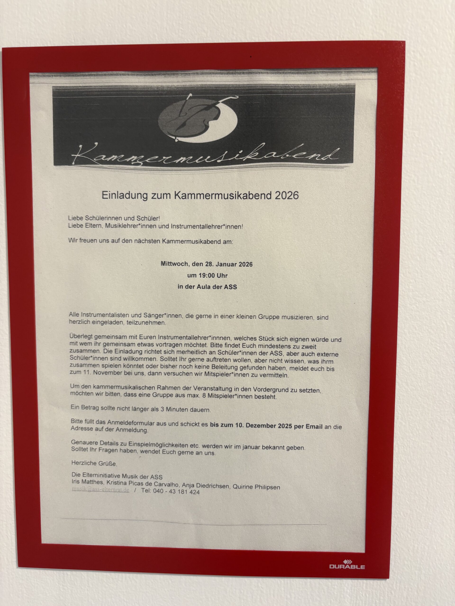 Der Kammermusikabend bietet Personen unserer Schulgemeinschaft eine besondere Bühne, ihr musikalisches Können in einem persönlichen und stimmungsvollen Rahmen zu präsentieren. Organisiert wird die Veranstaltung von der Elterninitiative Musik der Albert-Schweitzer-Schule.