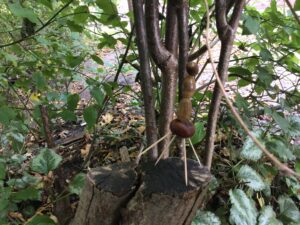 Nimm eine große und eine kleine Kastanie. Und stecke mit einem Zahnstocher die kleinere Kastanie vorne in die größere. Nun stecke 4cm Zahnstocher in die größere Kastanie.