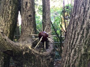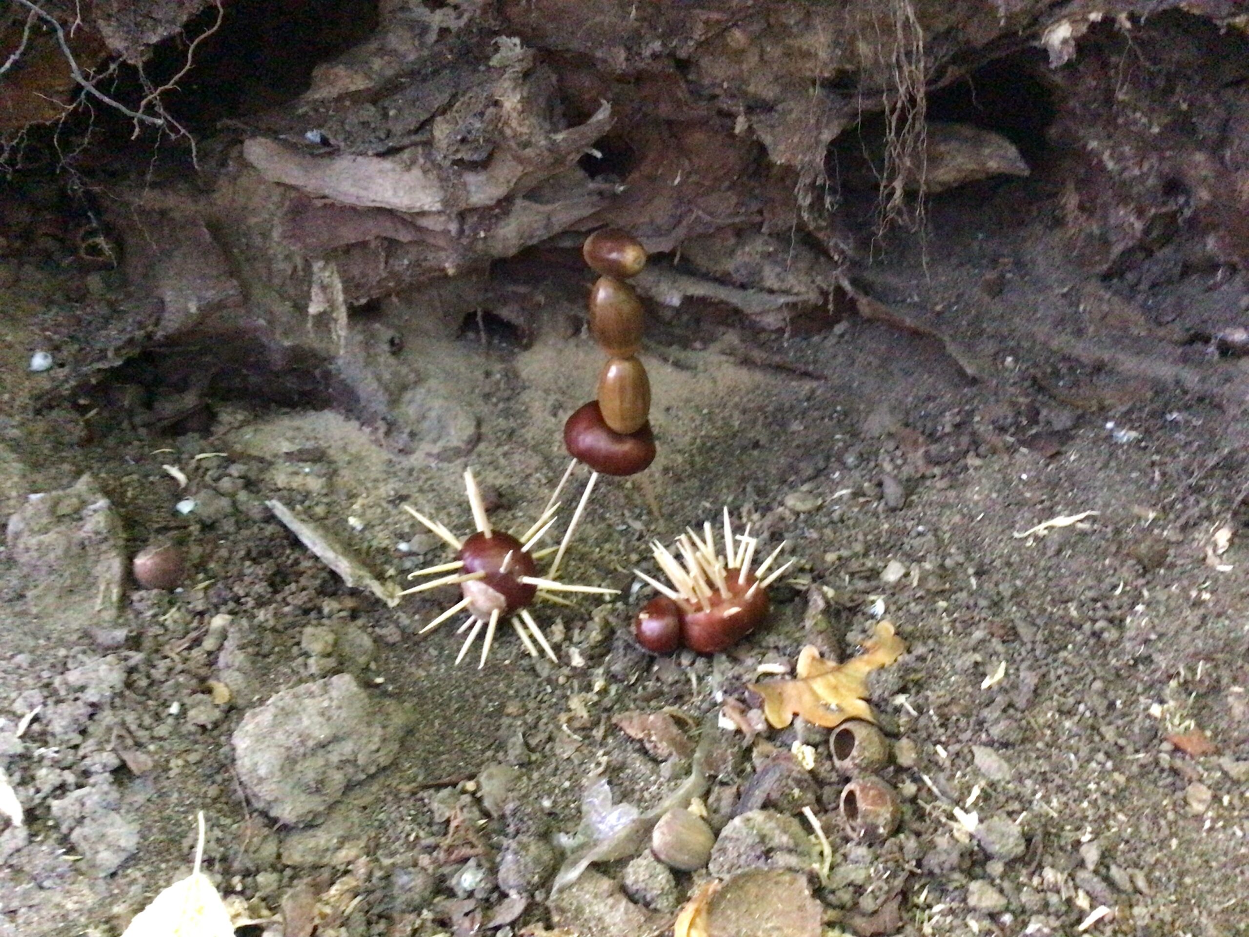 Nimm eine Kastanie und stecke überall in ungefähr einem Abstand von 1cm, 4cm Zahnstocher hinein in die Kastanie.